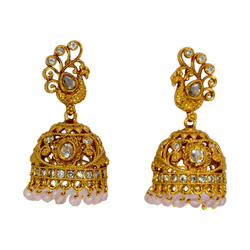 Add a touch of elegance to your ethnic look with this Trendy Antique Gold Plated Peacock Stone Jhumkha - Featuring a detailed peacock motif and sparkling stone accents.